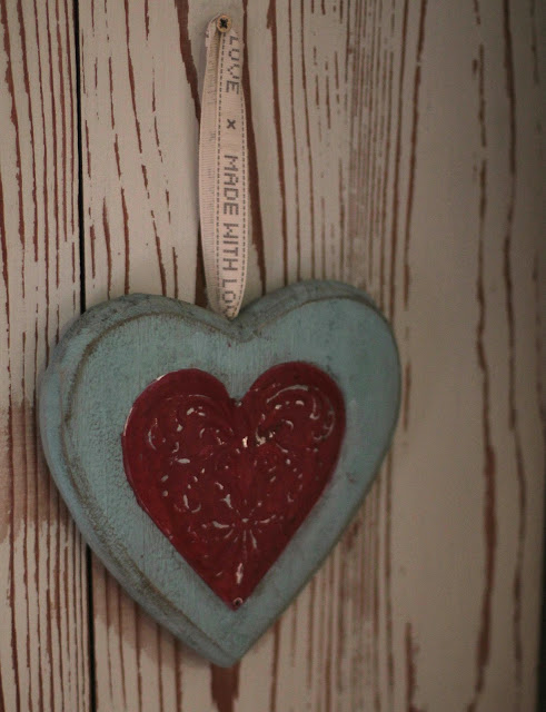 A szürke fa szívet Zsófi átfestette nekem kékre, a fém betétet pedig pirosra.